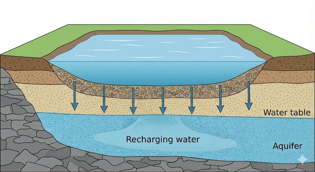 - Balsas de infiltración: Lagunas artificiales donde se almacena agua de lluvia para que se filtre lentamente.